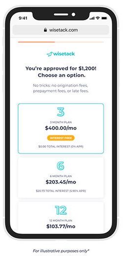 *All financing is subject to credit approval. Your terms may vary. Payment options through Wisetack are provided by our lending partners. For example, a $1,200 purchase could cost $104.89 a month for 12 months, based on an 8.9% APR, or $400 a month for 3 months, based on a 0% APR. Offers range from 0-35.9% APR based on creditworthiness. No other financing charges or participation fees. See additional terms at http://wisetack.com/faqs.